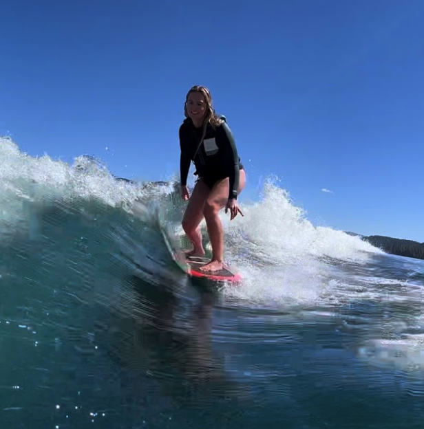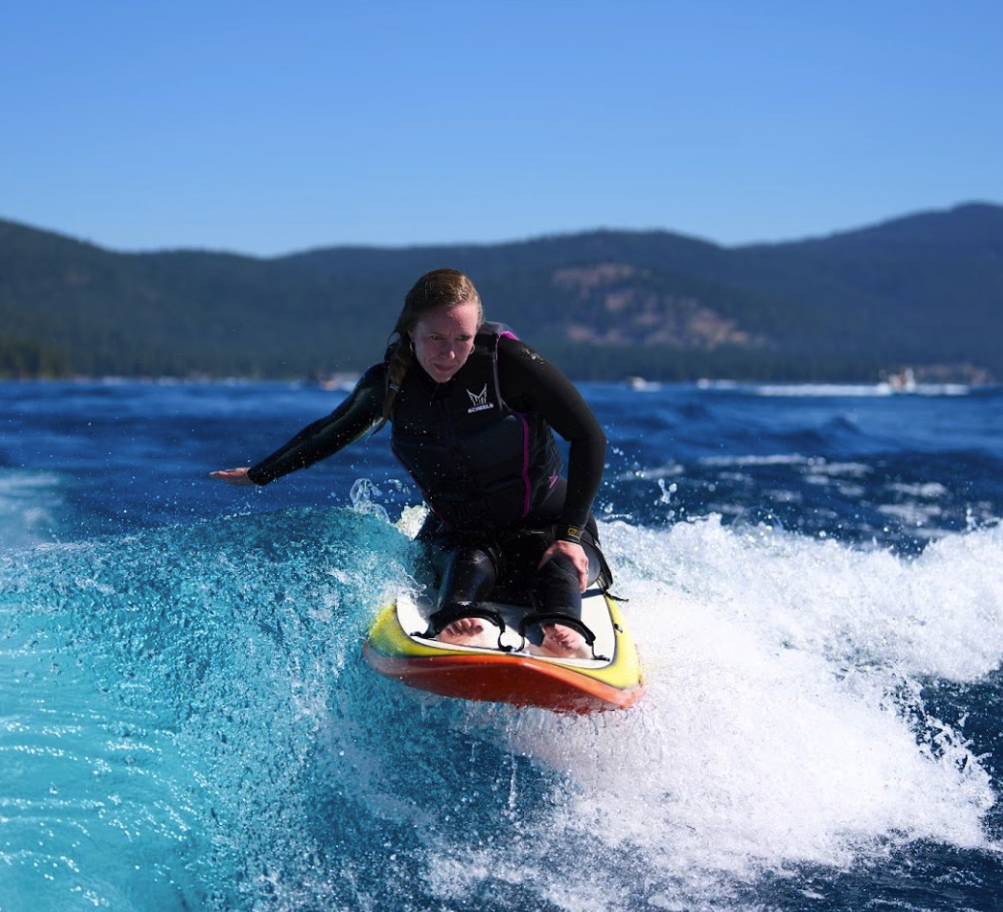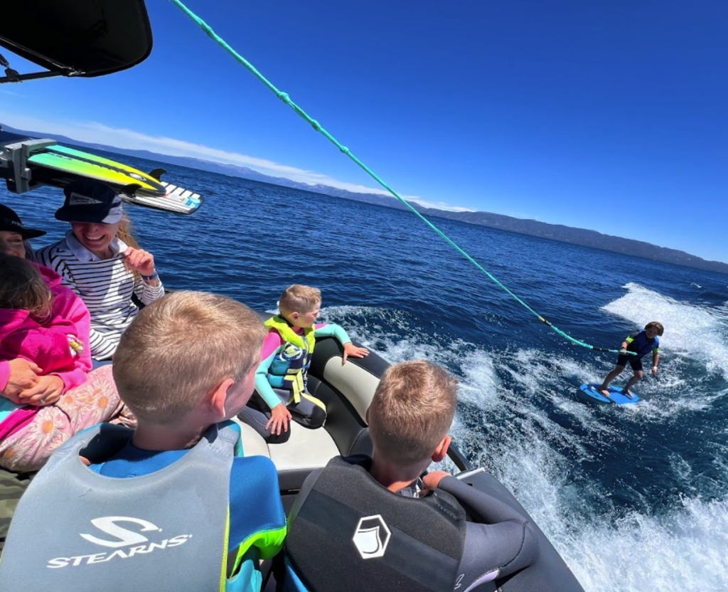 My boat is equipped with an adjustable wave system that’s perfect for wake surfing or foiling on Tahoe. We can tailor the waves to fit your skill level. Whether you’re a total beginner or a pro looking to take your skills to the next level, my goal is to make sure you’re comfortable, confident, and—most importantly—having fun, no matter your age or experience.